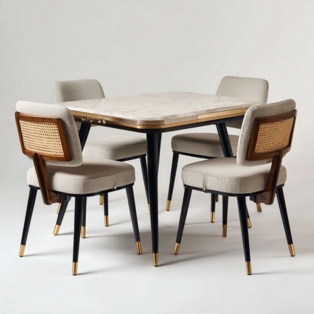Table carrée avec chaises – Plateau en marbre et pieds en bois et métal