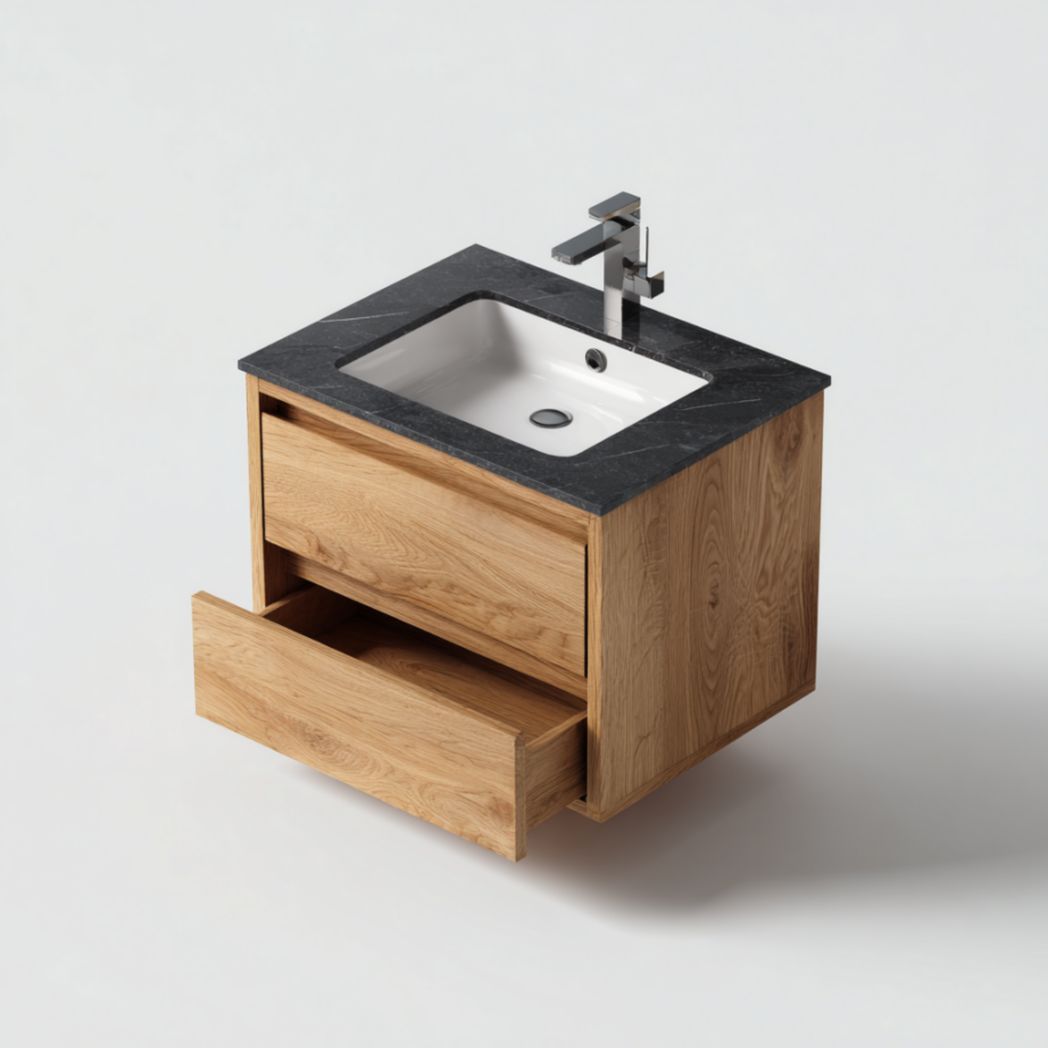Meuble de Salle de Bain Suspendu à 2 Tiroirs en Bois de Chêne avec Vasque en Céramique - Naturel
